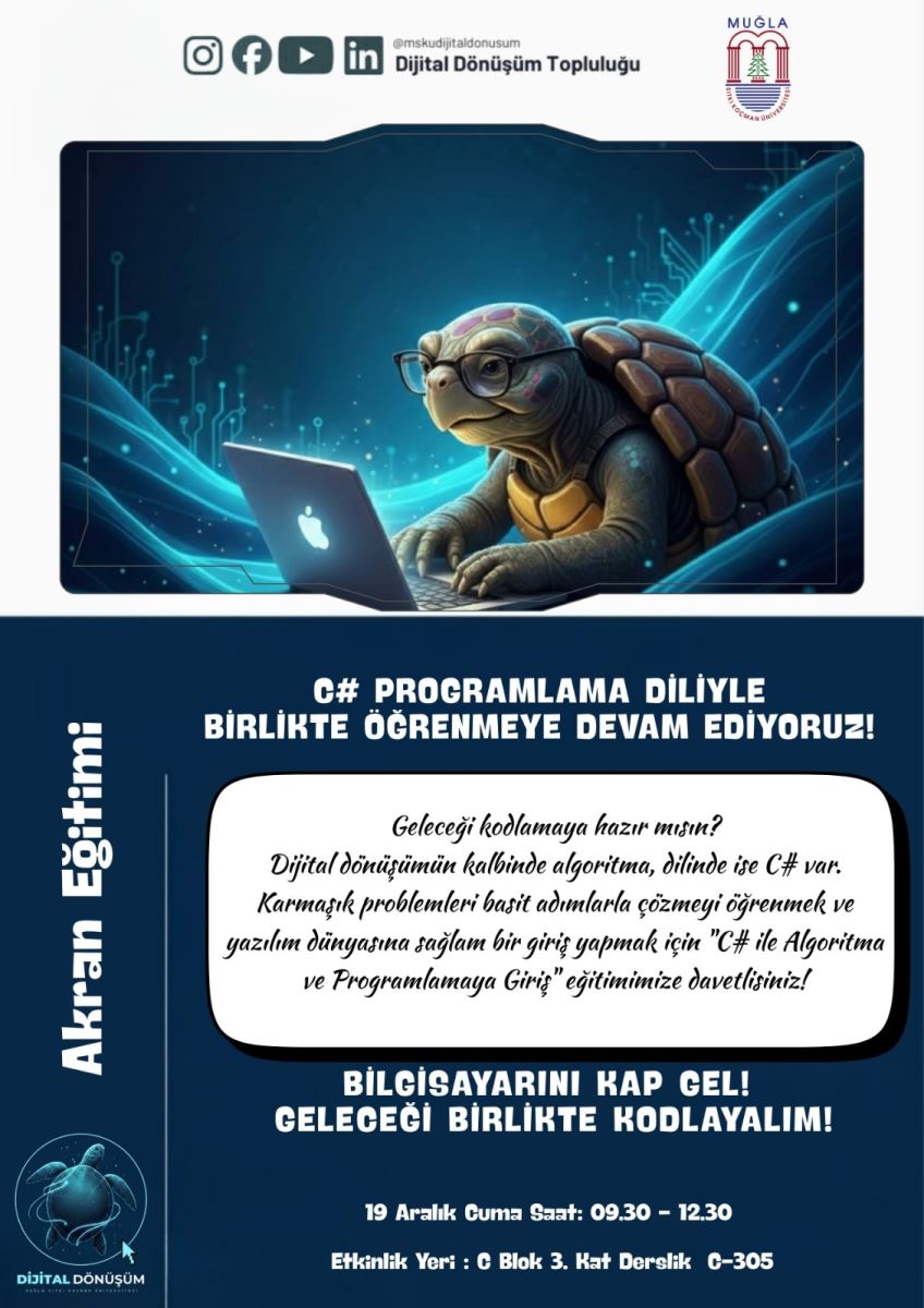 Dijital Dönüşüm Topluluğu tarafından düzenlenen "Akran Eğitimi" serisi kapsamında, 19 Aralık Cuma günü "C# ile Algoritma ve Programlamaya Giriş" etkinliği başarıyla tamamlandı.