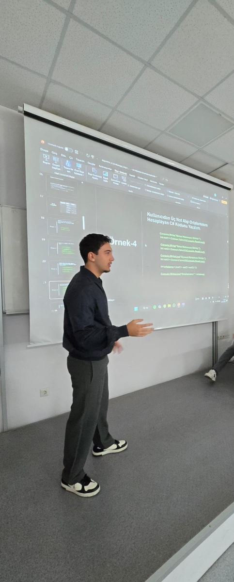 C Blok C-305 numaralı derslikte yoğun katılımla gerçekleşen eğitimde, öğrencilerimiz algoritma mantığını kavrayarak C# diliyle ilk kodlarını yazma fırsatı buldular. Karmaşık problemlerin basit adımlarla çözülmesine yönelik pratik uygulamaların yapıldığı etkinlikte, öğrenciler birbirlerinin öğrenme süreçlerine destek vererek "akran eğitimi" modelinin verimli bir örneğini sergilediler.
