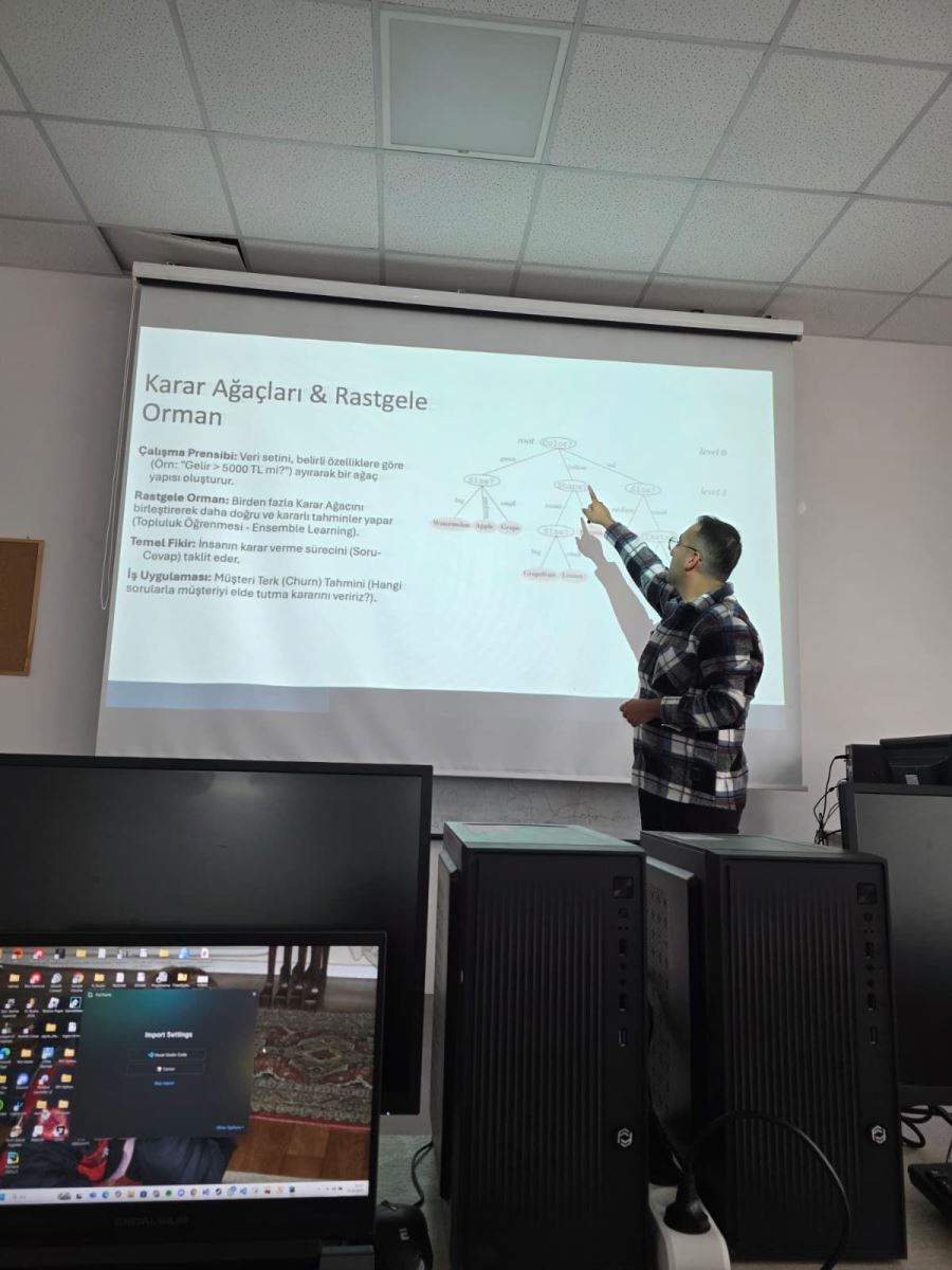 Bölümümüz Öğretim Elemanı Arş. Gör. Gökay GÜÇLÜ yürütücülüğünde gerçekleştirilen bu etkinlikte, öğrencilerimiz Yapay Zeka disiplininin temel algoritmaları ve güncel veri analizi metodolojileri üzerine uygulamalı bilgi edinmiştir.